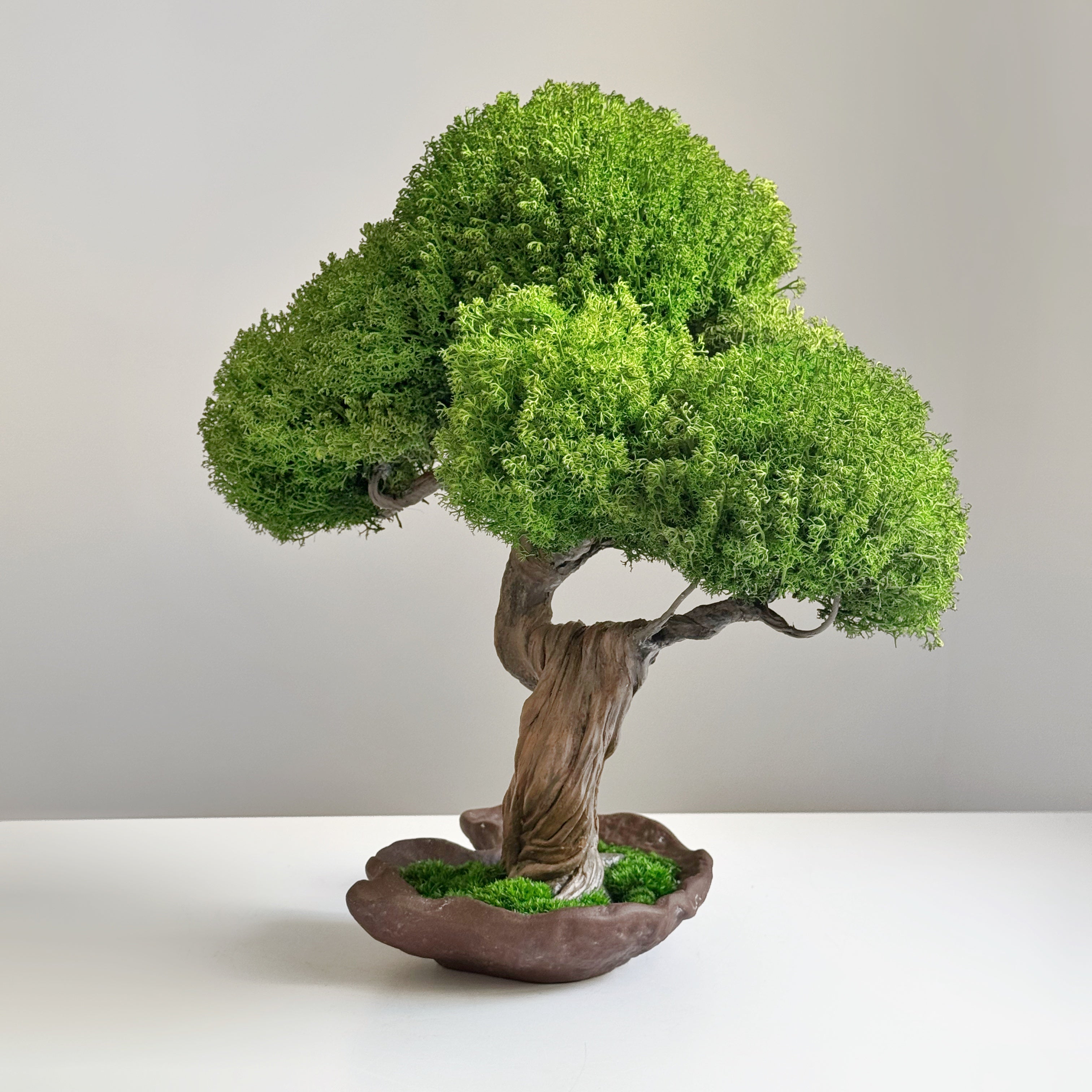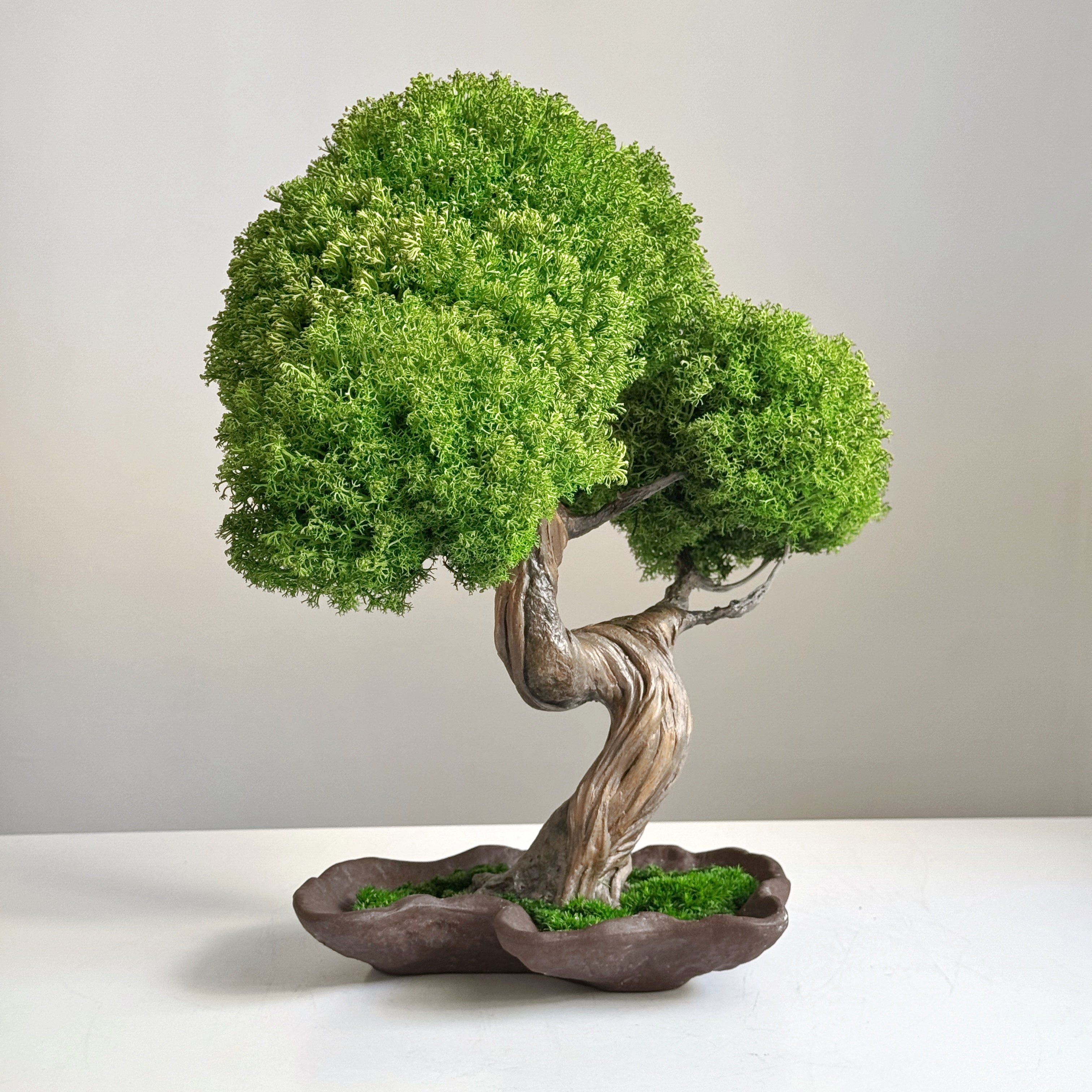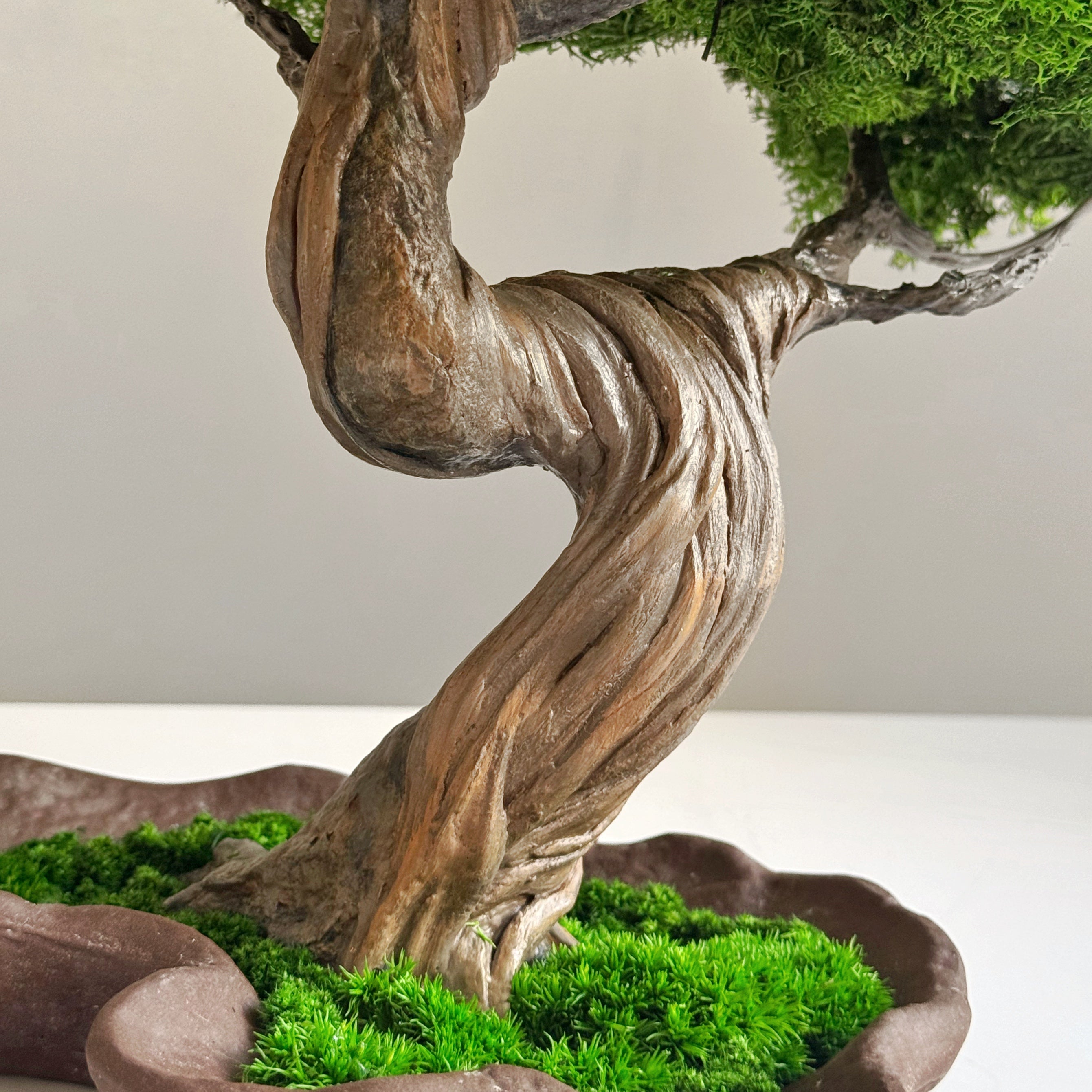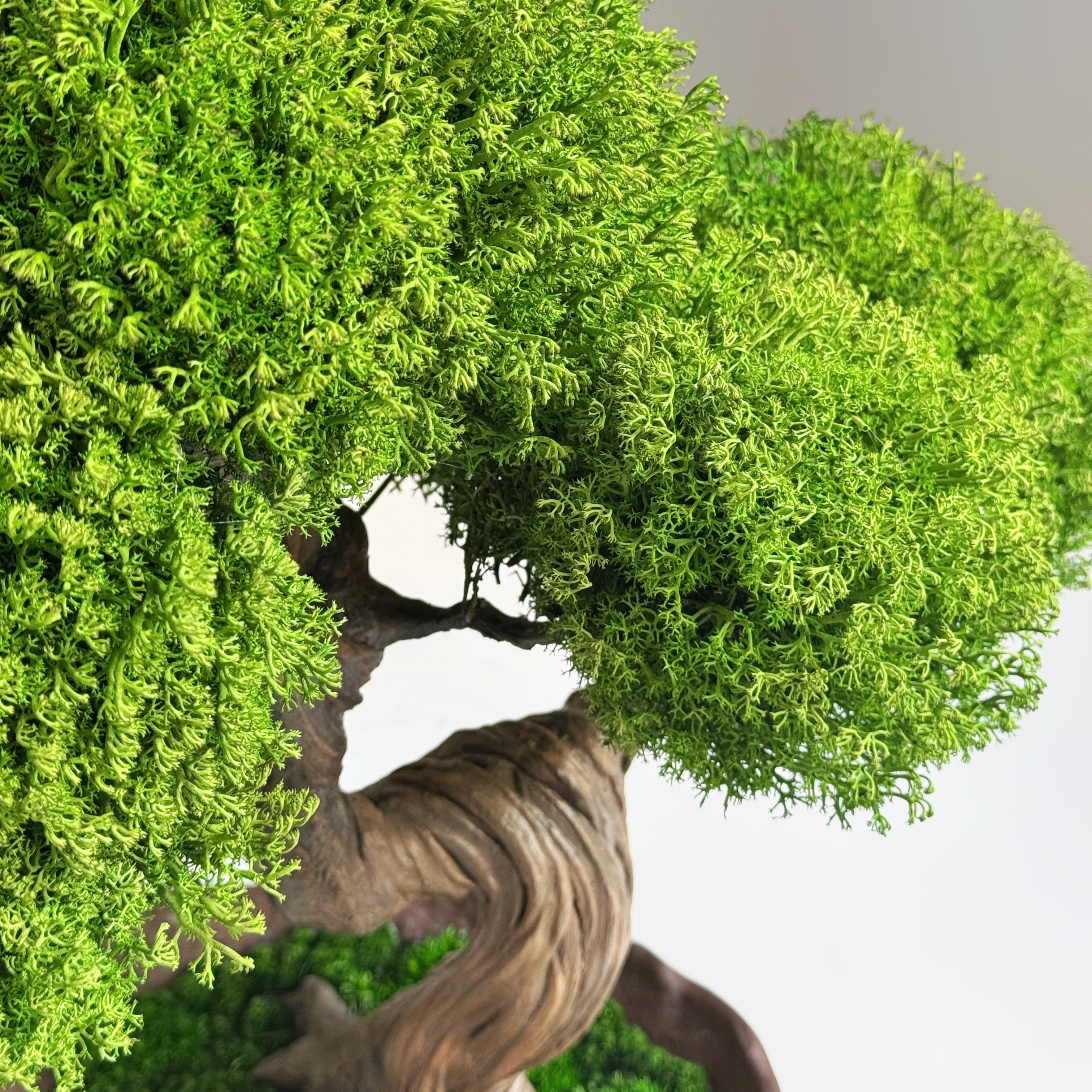 The bonsai is crafted from premium preserved botanicals and stabilized moss, carefully shaped to keep its volume and vivid green color for years. The hand-painted trunk imitates aged wood with natural curves, while the low, wavy base creates the feeling of a miniature Zen garden on your table or shelf.