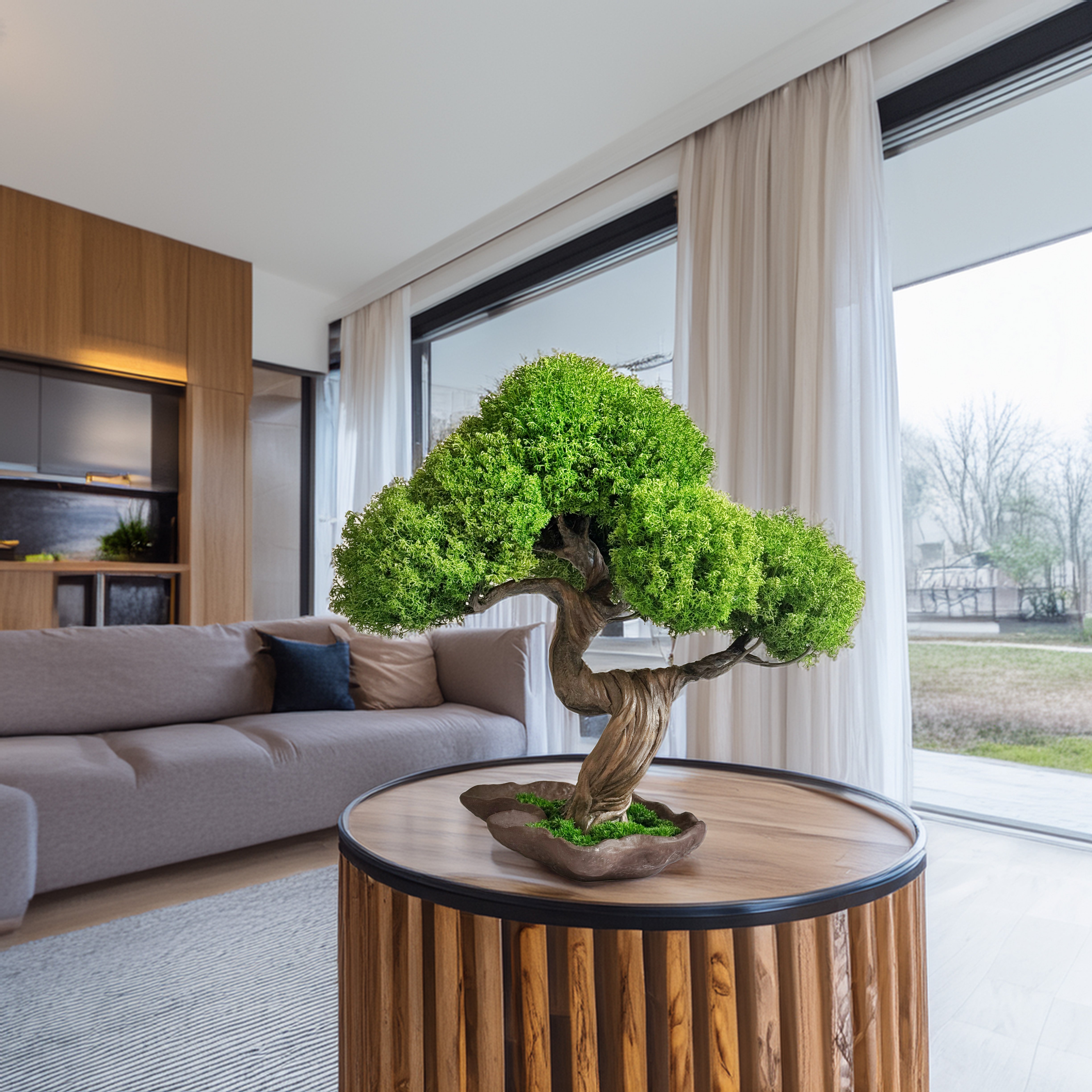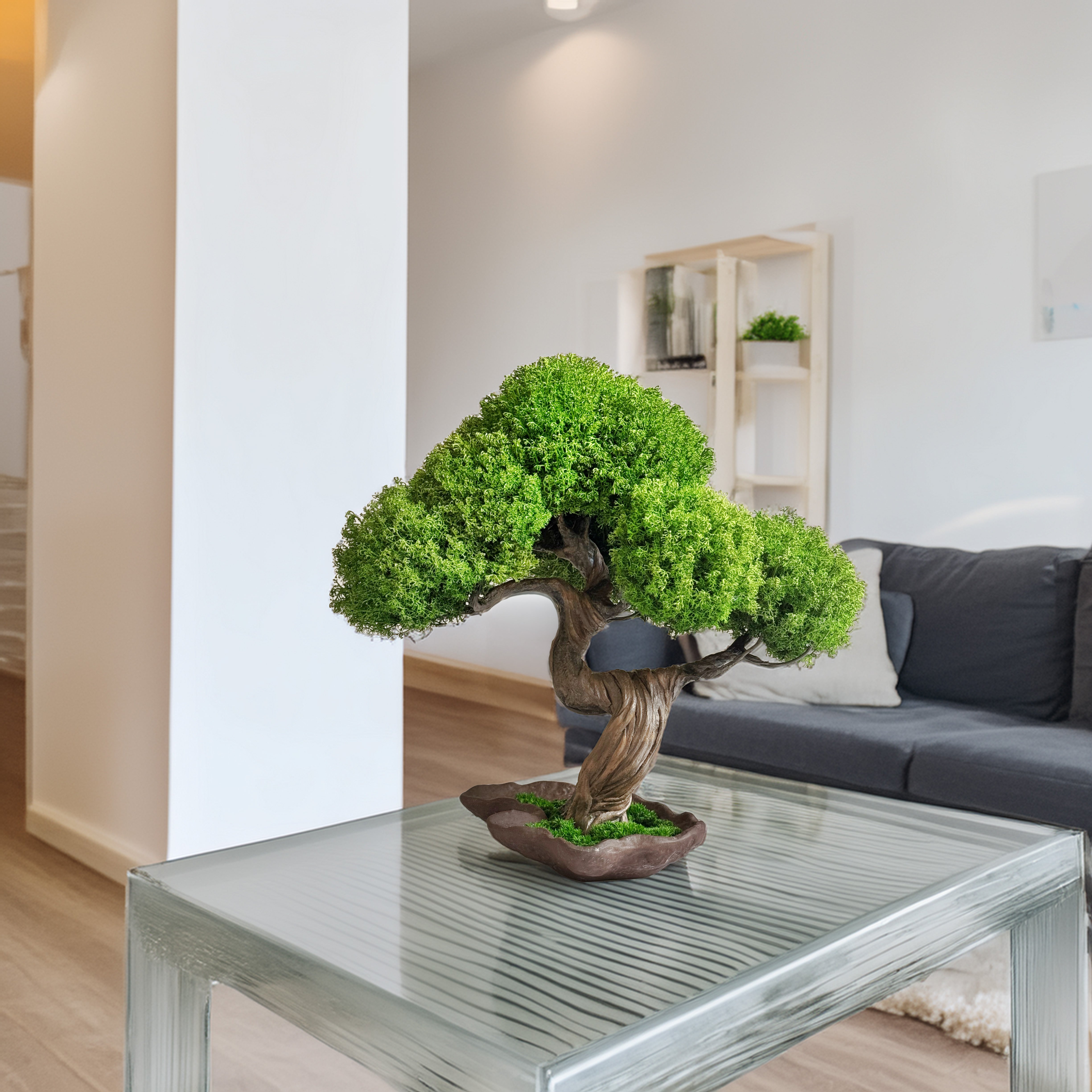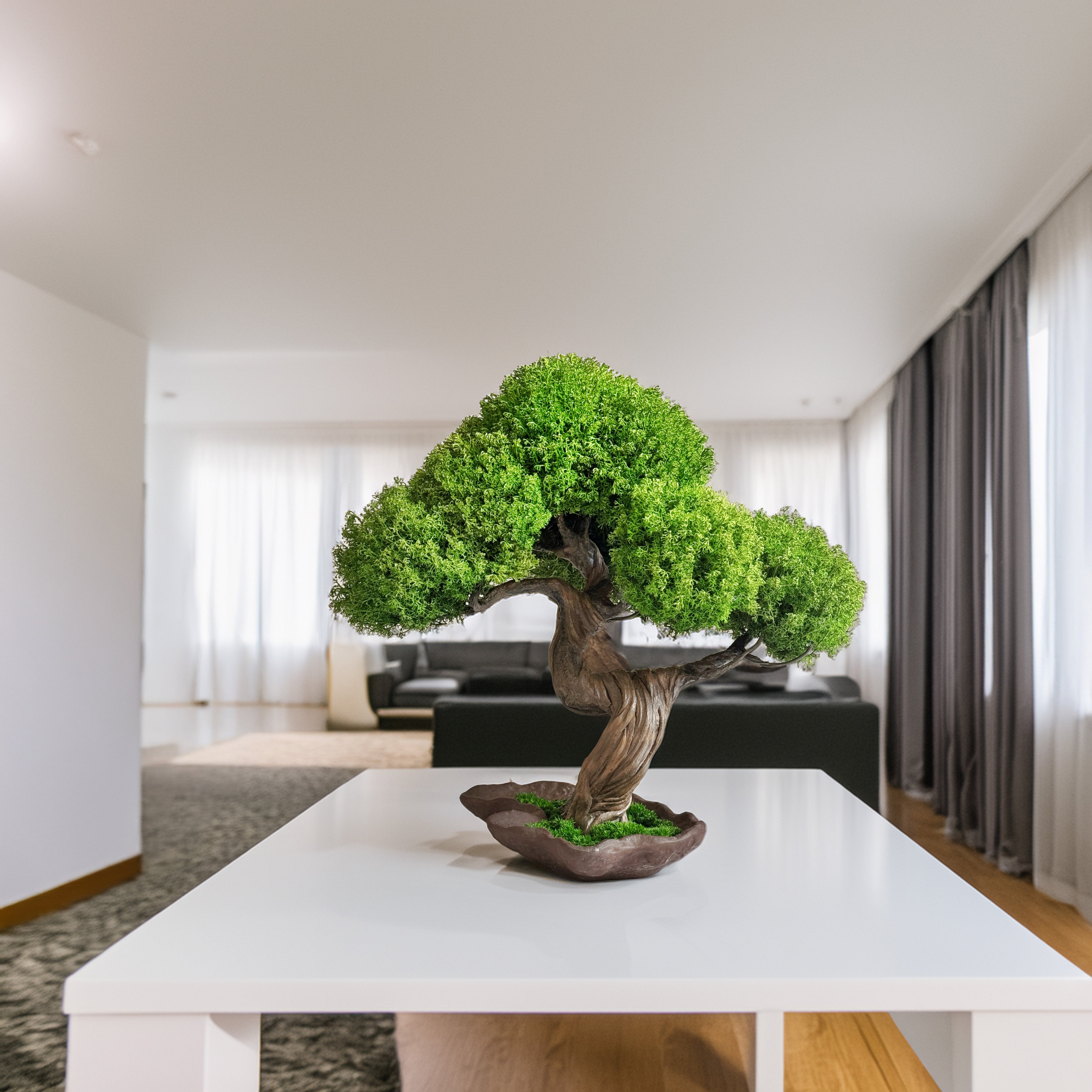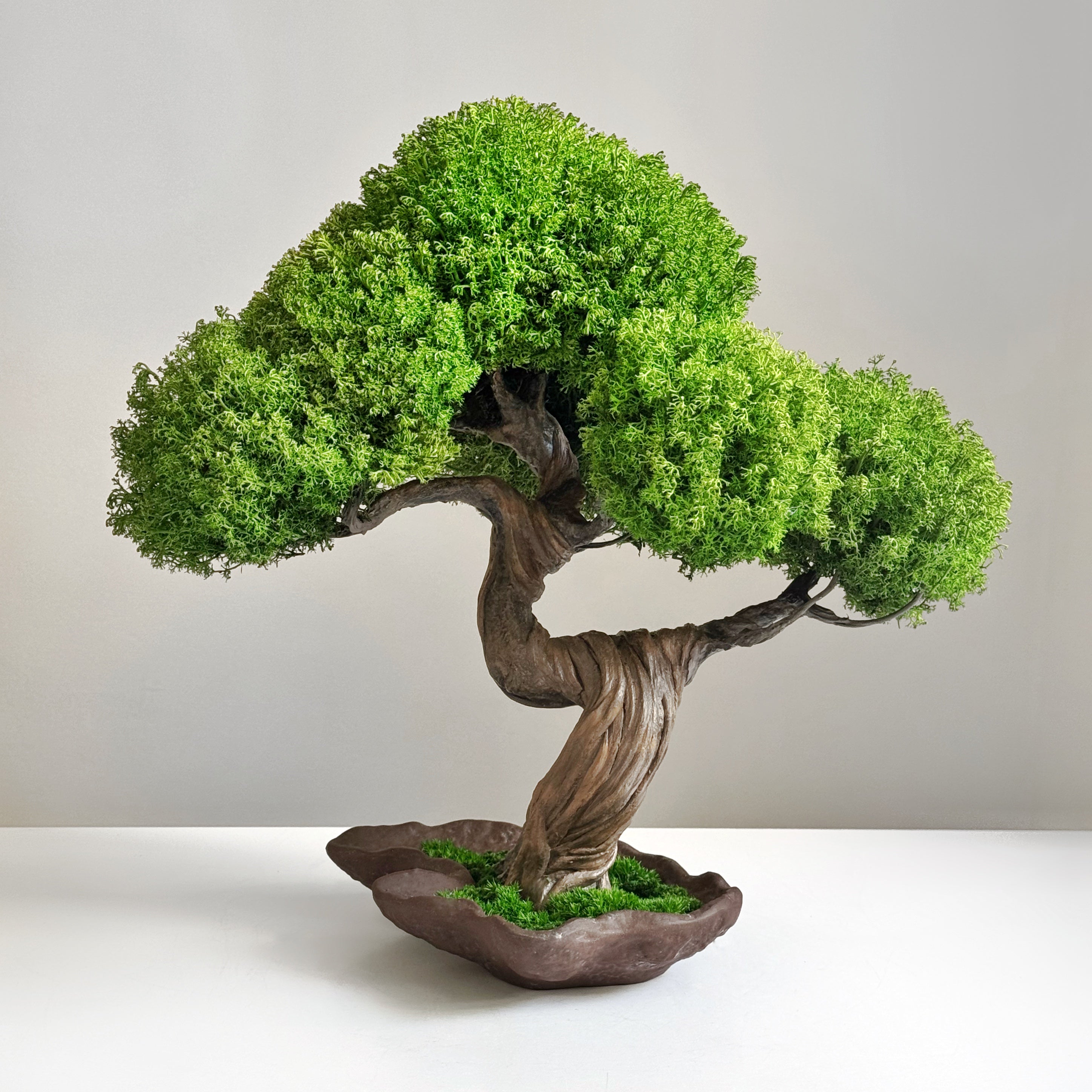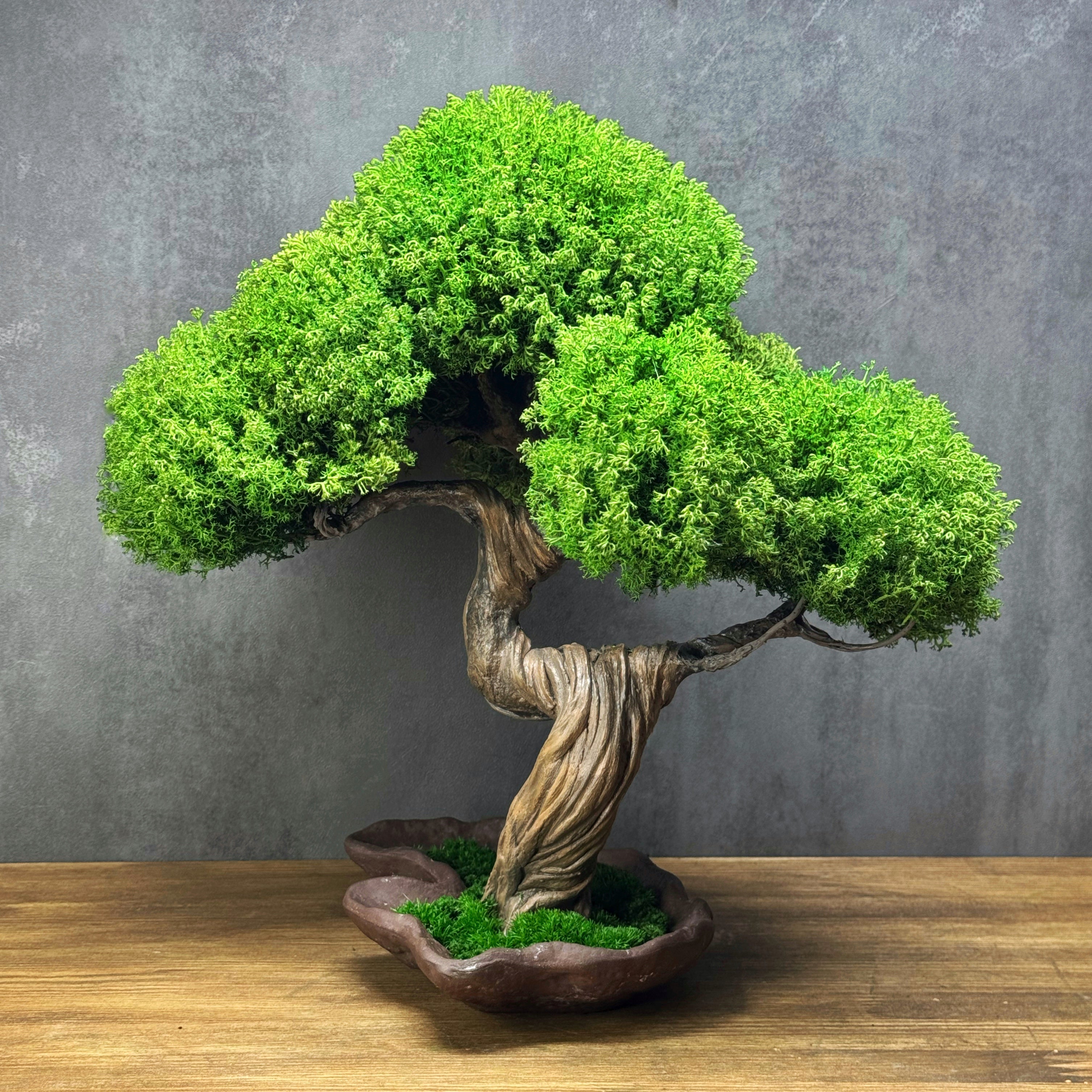 The bonsai is crafted from premium preserved botanicals and stabilized moss, carefully shaped to keep its volume and vivid green color for years. The hand-painted trunk imitates aged wood with natural curves, while the low, wavy base creates the feeling of a miniature Zen garden on your table or shelf.