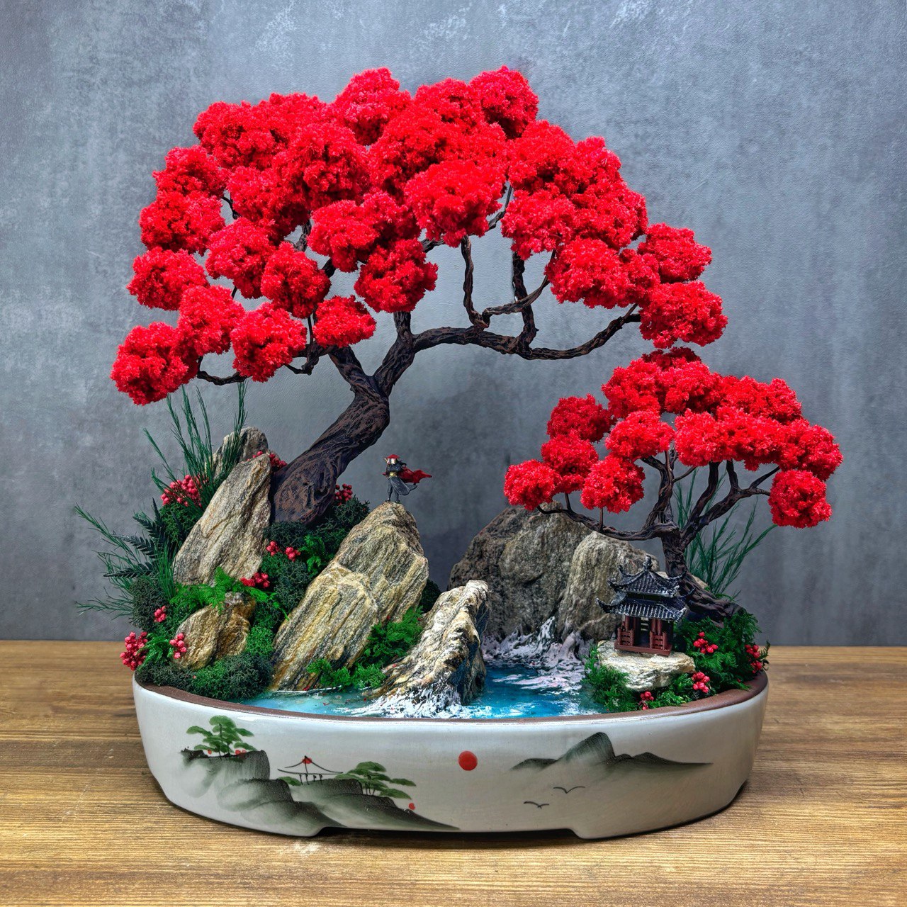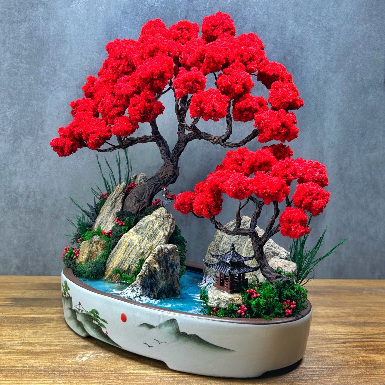 This composition captures the moment when the sun touches the horizon and the sky turns crimson. The red bonsai crowns echo the painted sun on the ceramic tray, while the cool blue water balances the scene. It’s more than decor — it’s a miniature world that brings focus, calm and inspiration to any room.