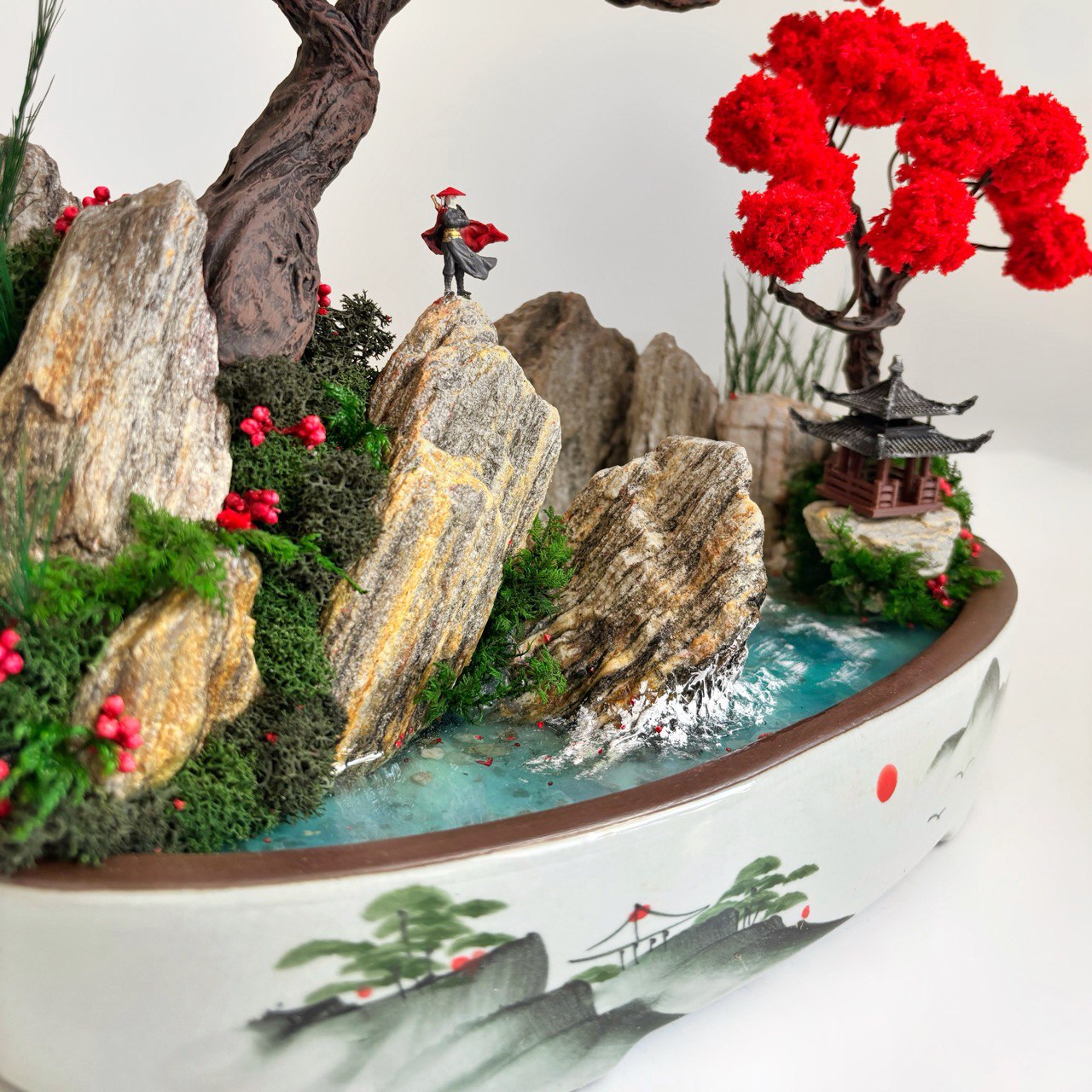 Ceramic tray with landscape, preserved moss and botanicals, epoxy resin water imitation with wave effect, artificial bonsai branches, miniature pagoda and warrior figurine, natural stones and decorative elements.