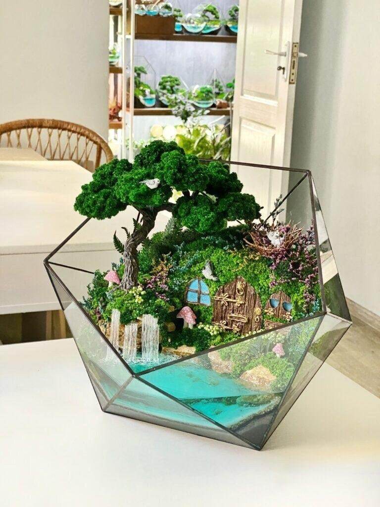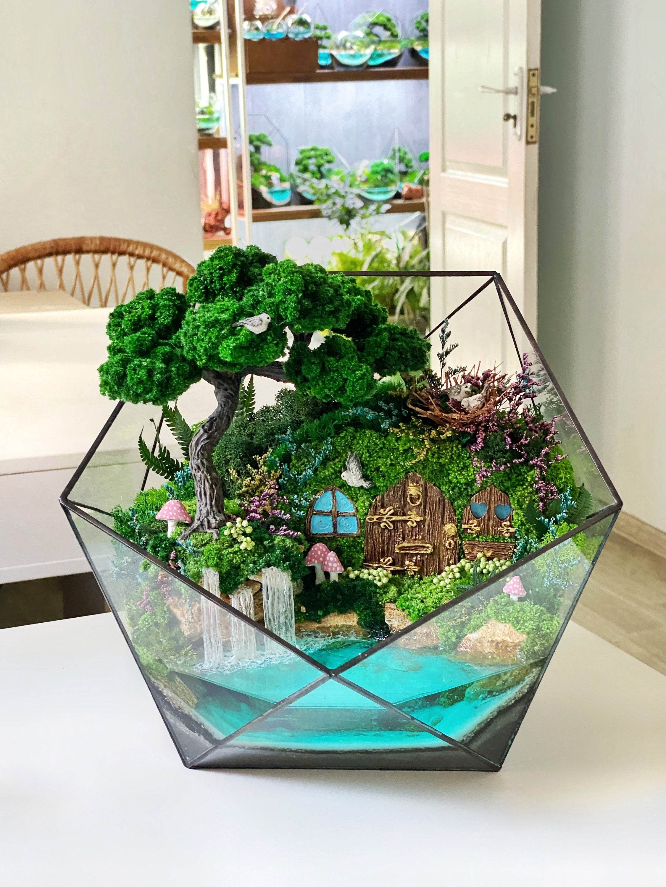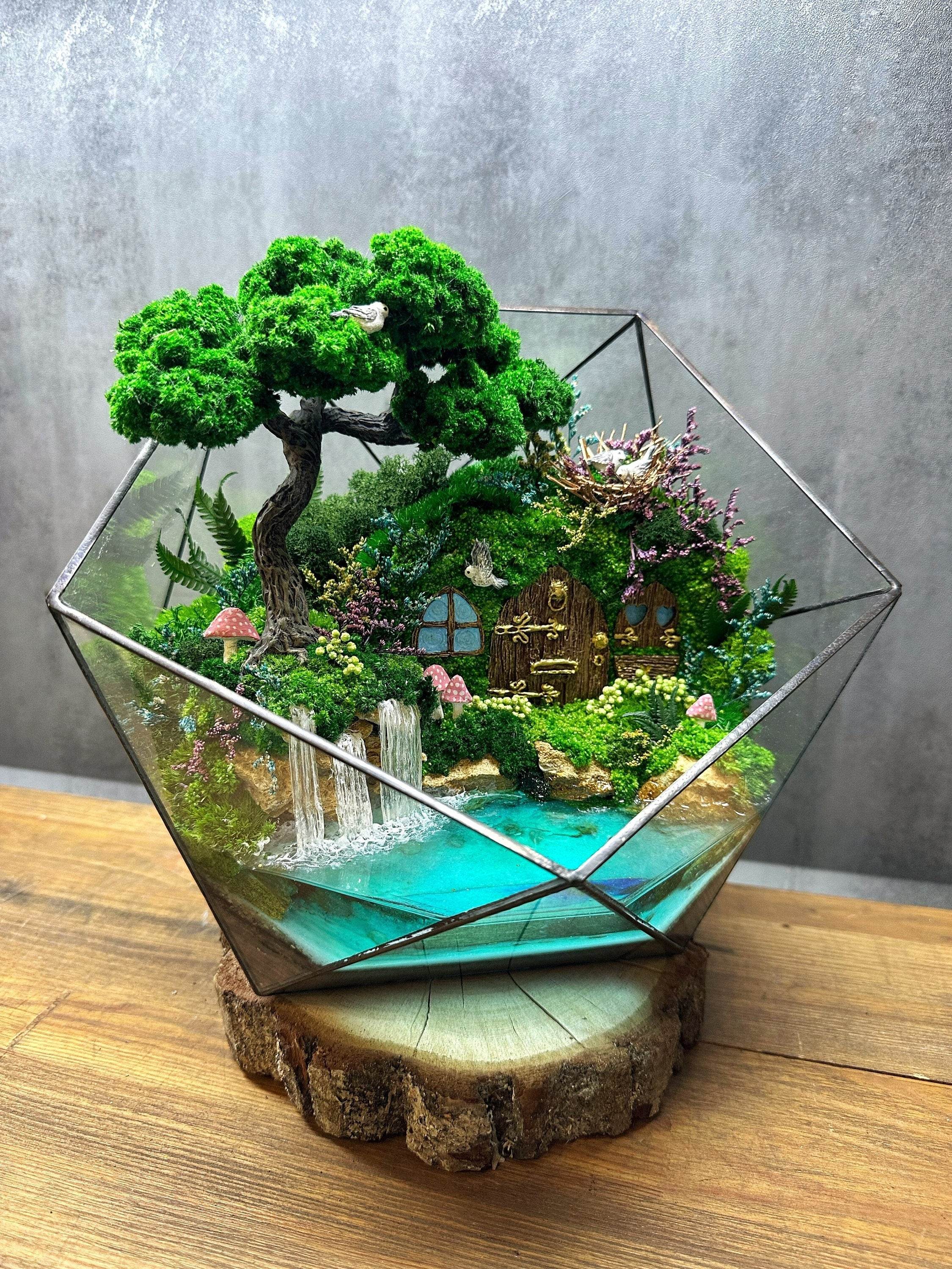 Fairy Tale Terrarium with preserved moss bonsai tree and glowing pond