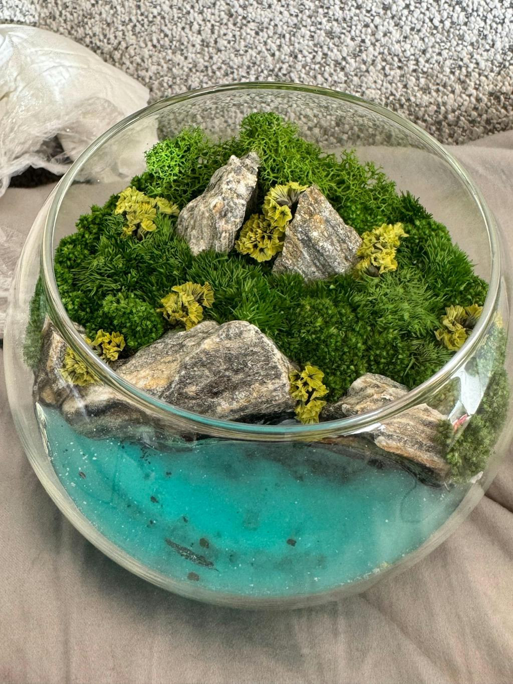 Bring a touch of nature and magic into any space with our Forest Lagoon terrarium. This compact glass bowl features vibrant preserved moss, natural stones, and a realistic pond imitation that softly glows in the dark or half-light. Perfect as a unique accent piece or a memorable corporate gift.