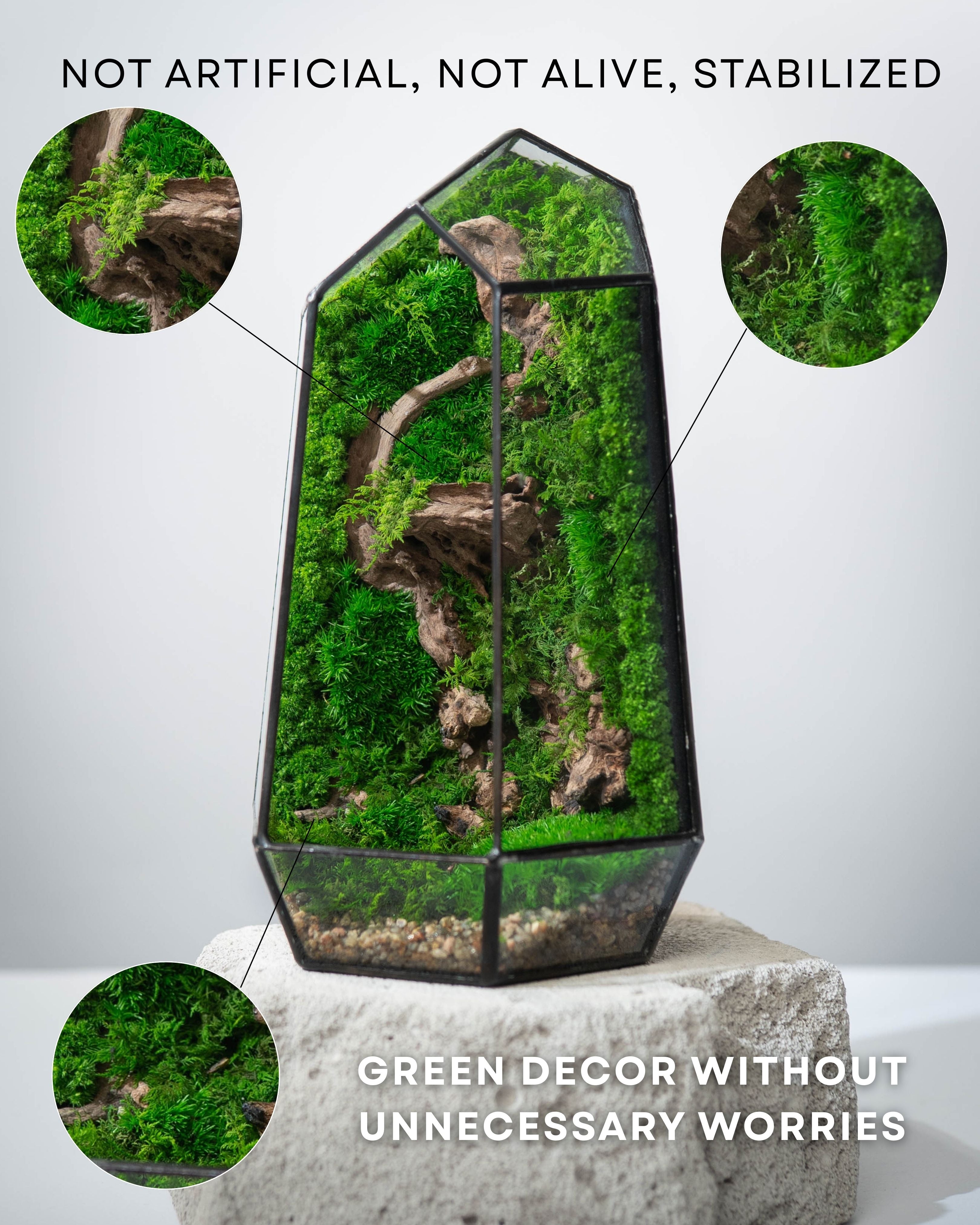 IT CONSISTS OF: Glass, stabilized moss, driftwood, decorative stones.